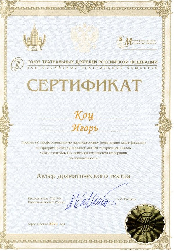 Wir gratulieren unserem Leiter Igor Kots zum Erwerb eines Zertifikates „ über die Qualifizierung als Schauspieler des dramatischen Schauspielhauses „ vom russischen Theaterbündnis in Moskau.